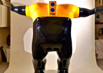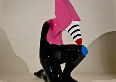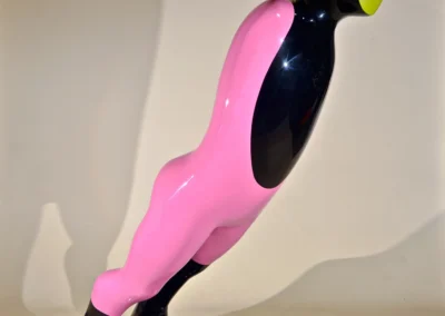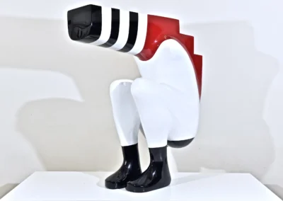 Firmly based in modernist morphology his colorful architectural forms abbreviate the human figure and nod to his background in monumental sculpture and interior design. Shendi juxtaposes cartoonish lemon, ultraviolet and pumpkin-coloured blocks, conjuring associations with children’s toys and industrial design and lending his pieces an emotive and playful quality. His candy-coated palette animates the archetypal themes he addresses in his work. Assisted by the use of colour to deceive the eye, flouting a sense of gravity and taking the attention away from the material also gives the work a strong optical impact.